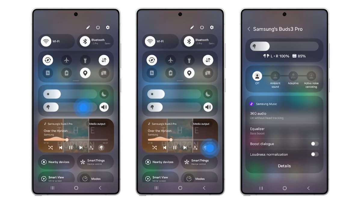 With One UI 7, users can now access and adjust their Galaxy Buds settings directly from the Quick Settings panel on their connected smartphones. This integration allows for seamless control over volume, noise cancellation modes (including Active Noise Cancelling, Ambient Sound, and Adaptive modes), 360 Audio, and equalizer presets without needing to open the Galaxy Wearable app. To access these controls, simply long-press the volume slider in the Quick Settings panel and tap the desired setting.